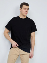 Футболка мужская из гладкокрашеного трикотажного полотна "кулирка с лайкрой"классического покроя со слегка удлиненными плечевыми швами, короткими втачными рукавами и горлорвиной овальной формы, обработанной втачной планкой. На левом рукаве настрочен декоративный элемент прямоугольной формы. По горловине настрочена двойная отделочная строчка. Низ рукавов и изделия обработаны подгибкой.