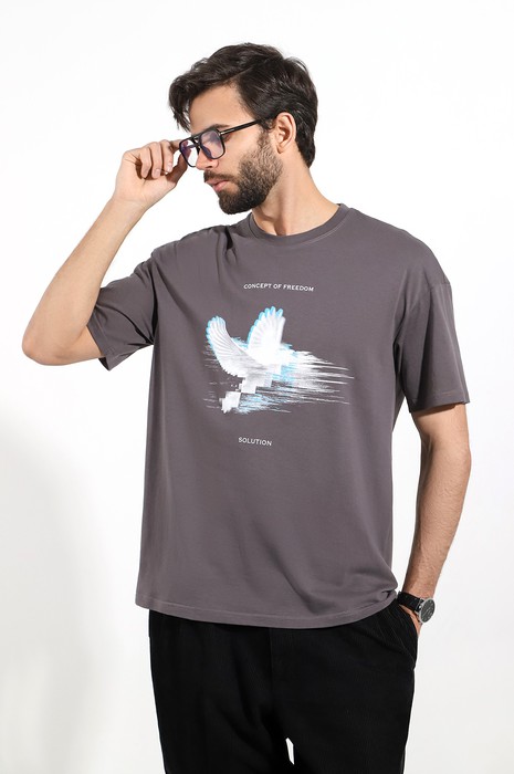 Футболка мужская из гладкокрашеного трикотажного полотна "кулирка", свободного покроя, со спущенным плечом и втачными короткими рукавами. Горловина овальной формы обработана втачной планкой. По шву втачивания планки настрочена двойная отделочная строчка. В центре переда - принт, выплненный в технике шелкографии.