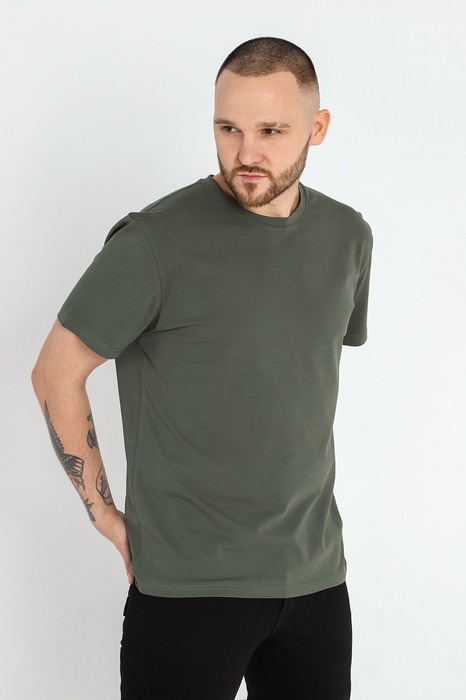 Базовая однотонная мужская футболка прямого силуэта без принта. Выполнена из трикотажного полотна: хлопкового с добавлением лайкры. Горловина округлой формы с усилителем горловины спинки.