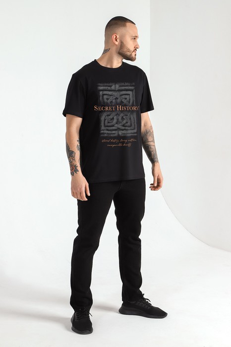 Футболка мужская из гладкокрашеного трикотажного полотна "кулирка" с лайкрой, классическогоь покроя, с коротким втачными рукавами, горловиной овальной формы, обработанной втачной планкой и принтом на полочке, выполненным в технике шелкографии.