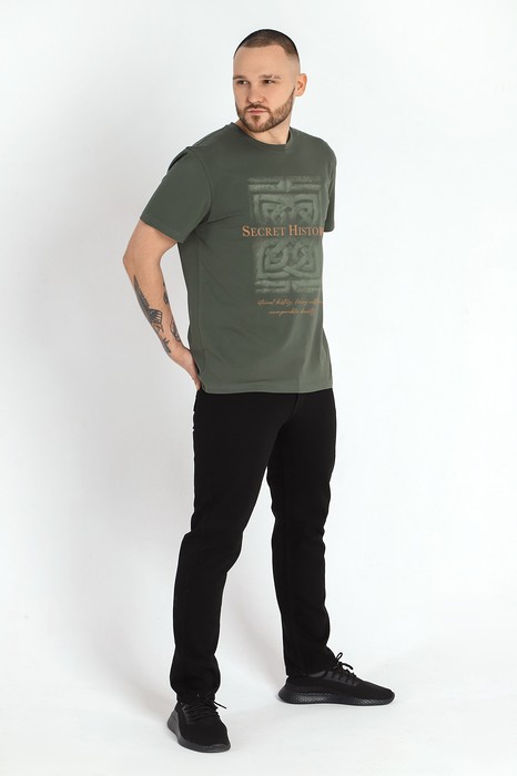 Футболка мужская из гладкокрашеного трикотажного полотна "кулирка" с лайкрой, классическогоь покроя, с коротким втачными рукавами, горловиной овальной формы, обработанной втачной планкой и принтом на полочке, выполненным в технике шелкографии.