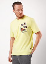 Яркая спортивная футболка с принтом на реглан рукаве. Воротник V-образный, двойной. На груди слева логотип.