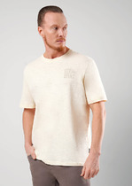 Мужская футболка из кулирки. Горловина с V-образным вырезом с отделкой другой тканью и пуговицами, на груди небольшой принт, короткие рукава, прямой силуэт. Четыре расцветки — белая, васильковая, темно-синяя и серый меланж. Размеры от 46 до 54. Возможна розница.