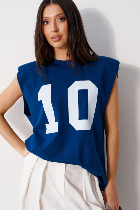Джемпер свободного кроя. Выполнен из мягкого трикотажа синего цвета. Без рукавов, есть съёмные подплечники. Длина спинки 71 см