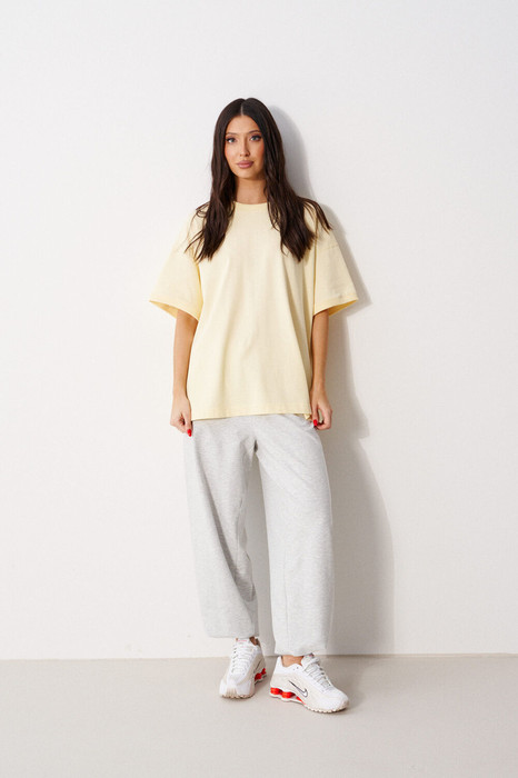 Футболка прямого свободного кроя, выполнена из трикотажного полотна желтого цвета. Характеристика: прямой крой, овальная горловина выполнена из довяза, рукав вточной спущенный, край выполнен из довяза, спинка цельнокраеная, на спинке под горловиной брендированная нашивка "ANNETE". Длина по спинке 68см, длина рукава от края горловины 40см.