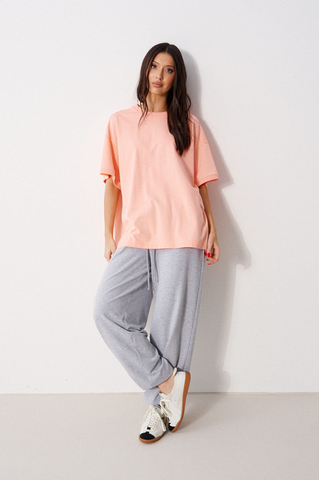 Футболка прямого свободного кроя, выполнена из трикотажного полотна персикового цвета. Характеристика: прямой крой, овальная горловина выполнена из довяза, рукав вточной спущенный, край выполнен из довяза, спинка цельнокраеная, на спинке под горловиной брендированная нашивка "ANNETE". Длина по спинке 68см, длина рукава от края горловины 40см.