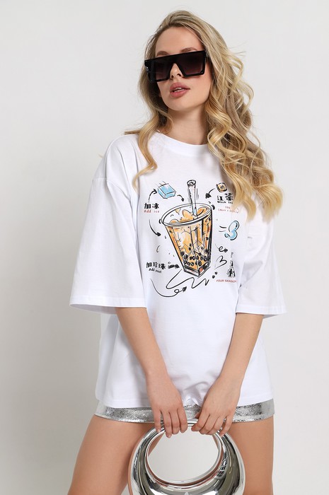 Футболка молодежная из гладкокрашеного свободного покроя оверсайз, с короткими втачными рукавами, спущенной линией плеча, горловиной овальной формы, обработанной широкой втачной планкой, и принтом на полочке, выполненным в технике «шелкографии».