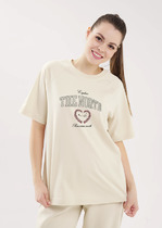 Футболка молодежная из гладкокрашеного трикотажного полотна «кулирка с лайкрой», свободного покроя, с втачными короткими рукавами, широкой подгибкой по низу изделия и нижним срезам рукавов. На полочке выполнена печать в технике «шелкографии». Горловина овальной формы обработана втачной планкой с отделочной строчкой по шву притачивания.