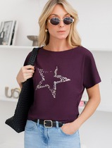 Футболка – свободного покроя, со спущенной линией плеч, втачными короткими рукавами, горловиной овальной формы, обработанной притачной планкой и принтом на полочке, выполненным в технике «шелкографии».