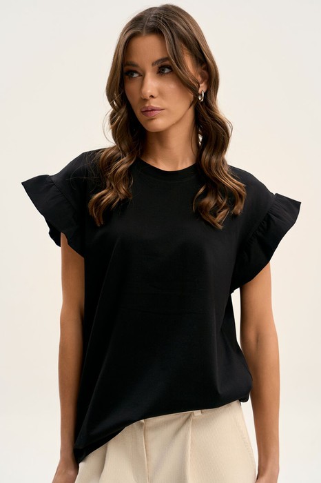 В этой футболке с воланами от GOwear вы не останетесь незамеченной! Вы легко сможете собрать много стильных образов с вашими юбками, шортами, жакетами и брюками!
