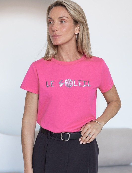 Состав: 100%Хлопок Плотность: 140 Г/м2Футболка прямого кроя выполнена из 100% хлопка. Базовая модель дополнена лаконичным авторским принтом. Легко впишется в повседневный гардероб. Изделие хорошо держит форму и обеспечивает комфортный микроклимат в течение дня. Перевод надписи на принте: "le soleil (фр.) - солнце"