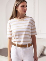 Состав: 92%Хлопок 8%ПУ Плотность: 170 Г/м2 Параметры модели на первом фото: Рост 170, бюст 83, талия 64, бедра 88Футболка выполнена из премиального хлопка. Наличие эластана гарантирует абсолютный комфорт и долговечность изделия. Модель в полоску предлагаем сочетать с однотонными вещами базовой палитры. Изделие дополнено металлическим логотипом бренда.
