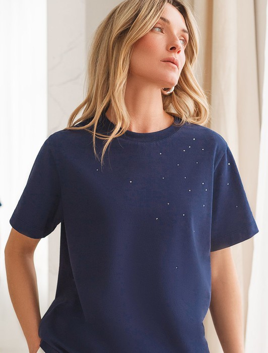 Состав: 92%Хлопок 8%ПУ Плотность: 170 Г/м2 Параметры модели на первом фото: Рост 172, бюст 88, талия 64, бедра 88Футболка выполнена из премиального хлопка. Лаконичный принт нанесен россыпью сияющих страз, надежно закрепленных на изделии. Наличие эластана в составе гарантирует комфорт и формоустойчивость. Изделие дополнено фирменным металлическим логотипом бренда.