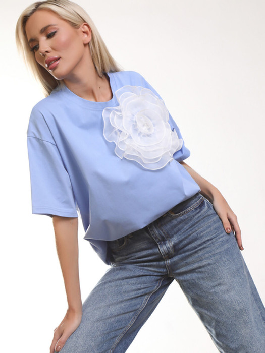 Футболка их хлопка голубого цвета с декором в виде броши-цветка из органзы.