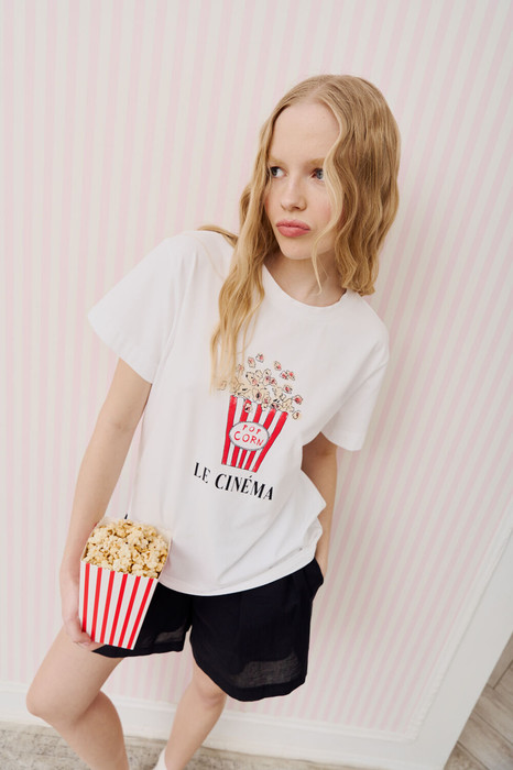 Футболка свободного кроя прямого силуэта, линия плеча спущена, рукав короткий, округлый вырез горловины обработан бейкой, по центру печать.