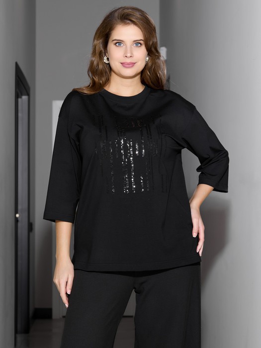 Футболка женская из гладкокрашенного трикотажного полотна «кулирка с лайкрой», свободного покроя, со спущенным плечом и втачными рукавами длиной до локтя, горловиной овальной формы, обработанной втачной планкой. По центру полочки выполнена вышивка «пайетками» в тон изделия. В нижней части боковых швов небольшие разрезы.