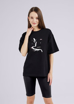 Стильная молодёжная футболка в стиле Casual, из хлопкового трикотажного полотна. Модель свободной формы с  коротким рукавом. Горловина оформлена полосатой тесьмой-довязом. Перед модели декорирован стильной дизайнерской печатью.