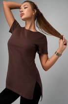 Футболка из гладкокрашеного трикотажного полотна «кулирка» с эффектом «варенки», свободного покроя, горловиной овальной формы, обработанной притачной планкой. Низ рукавов и изделия состоит из двух частей, одна из которых с необработанным краем, другая с подгибкой и соединенных между собой накладным швом.