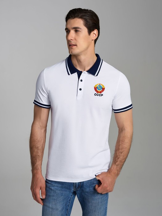 Футболка-поло из хлопкового полотна "пике". Классическая модель поло с короткими рукавами. Воротник и манжеты рукава выполнены из трикотажной рибаны темно-синего цвета с белой полосой. На полочке застежка-планка на пуговицах. На груди вышивка "СССР". По низу футболки в боковых швах выполнены разрезы, обработанные тесьмой.