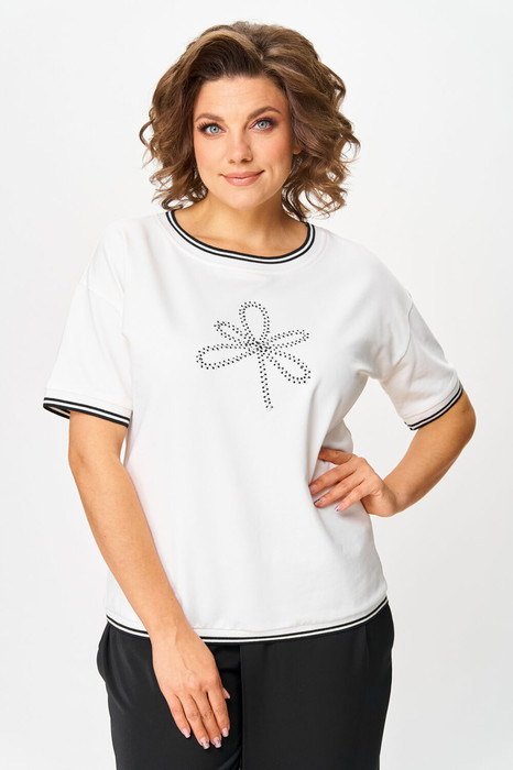 Джемпер женский из трикотажной хлопковой ткани (двунитка). По переду футболки расположен декоративный элемент из тесьмы. Спущенное плечо. Низ рукава, низ изделия и вырез горловины обработаны отделочной тесьмой. Спинка без среднего шва.