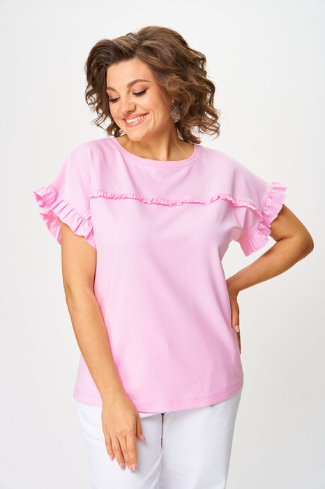 Джемпер женский прямого силуэта. Перед джемпера оформлен притачной кокеткой по полочке и спинке. В шов притачивания вставлена рюша. Спущенное плечо. Вырез горловины "круглый", оформлен бейкой.