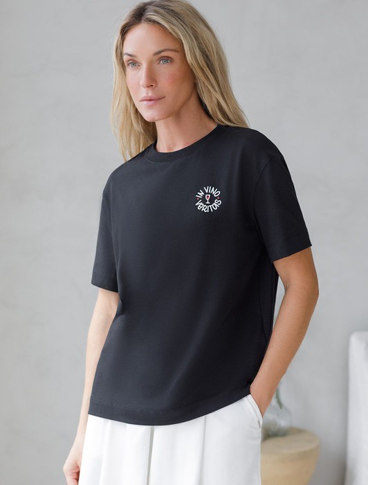 Особое внимание привлекает стильный принт в виде бокала с минималистичной надписью. Перевод надписи: In vino veritas - Приходит вино - уходит истина. Принт выполнен красками с устойчивым покрытием, который добавляет изделию оригинальности и позволяет выразить индивидуальность.
