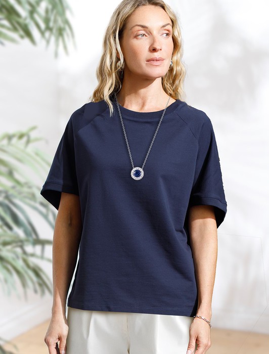 Состав: 95%Хлопок 5%ПУ Плотность: 240 Г/м2Футболка темно-синего цвета свободного кроя выполнена из премиального футера двухнитки с эластаном плотностью 240 Г/м2. . Натуральный материал отличается мягкостью и приятной текстурой, позволяя коже дышать и обеспечивая максимальное удобство при носке. Наличие эластана в составе изделия гарантирует абсолютный комфорт и формоустойчивость. Круглый ворот, рукава регланы средней длины и спущенная линия плеча придают футболке стильный и современный вид, делают образ расслабленным и непринужденным, такой вариант отлично сядет на большие размеры. Плотная футболка идеально подходит для повседневной носки и незаменима для тех, кто ценит удобство и свободу движений без компромиссов по стилю.