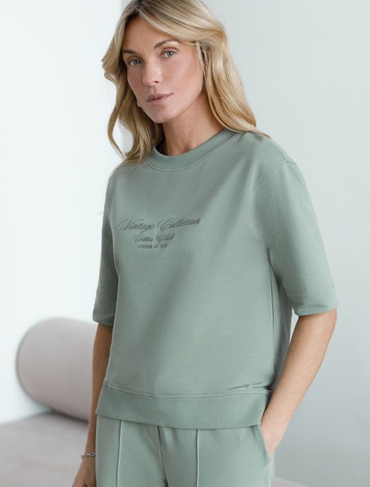 Состав: 95%Хлопок 5%ПУ Плотность: 240 Г/м2 Параметры модели на первом фото: Рост 172, бюст 88, талия 64, бедра 88 Размер товара на первом фото: 42Футболка светло-оливкового цвета свободного кроя выполнена из премиального футера двухнитки с эластаном плотностью 240 Г/м2. . Натуральный материал отличается мягкостью и приятной текстурой, позволяя коже дышать и обеспечивая максимальное удобство при носке. Наличие эластана в составе изделия гарантирует абсолютный комфорт и формоустойчивость. Круглый ворот, рукава средней длины и спущенная линия плеча придают футболке стильный и современный вид, делают образ расслабленным и непринужденным, такой вариант отлично сядет на большие размеры. Футболку украшает принт виде надписи. Перевод надписи: Vintage collection - Витнажная коллекция. Плотная футболка идеально подходит для повседневной носки и незаменима для тех, кто ценит удобство и свободу движений без компромиссов по стилю.