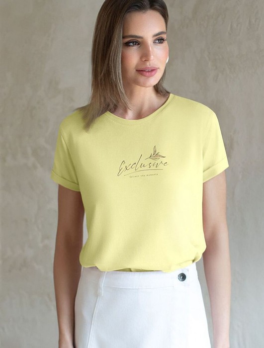 Модная футболка лимонного цвета привлекает внимание своим интересным дизайном и ярким принтом. Благодаря прямому крою изделие комфортно садится на любую фигуру, в том числе на большие размеры, и не сковывает движений. Круглый вырез подчеркивает современный стиль, а натуральный материал из хлопка с добавлением эластана обеспечивает удобство в повседневной носке и приятные тактильные ощущения. Прочность и износостойкая структура сохраняет первоначальную форму футболки после множества стирок. Рукава имеют аккуратные подгибы, что придает изделию завершенность и помогает сохранять аккуратный внешний вид. Принт надписи нанесен красками с устойчивым покрытием, перевод надписи: Exluzive moments collection only - Только коллекция эксклюзивных моментов. Стильная футболка гармонично вписывается в любой гардероб и подойдет для прогулок, отдыха дома или неформальных встреч. Благодаря особенностям кроя модель хорошо сидит, скрывая недостатки и подчеркивая достоинства. Удобная футболка идеально сочетается с базовыми вещам