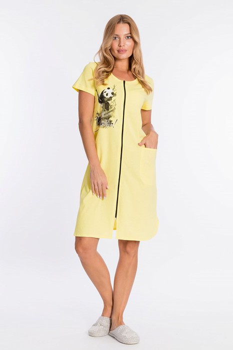 Женский халат с застёжкой на молнию выполнен из однотонной кулирки. По бокам размещены карманы, спереди и на спинке нанесены принты.