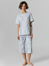 Халат из трикотажного полотна «кулирка» с набивным рисунком, свободного покроя, расширенный книзу, с короткими втачными рукавами, горловиной овальной формы, карманами в боковых швах и центральной бортовой застежкой на тесьму «молния». Полочка – с рельефами, выходящими из плечевых швов. Центральные части полочек – из двух частей каждая. Нижние центральные детали полочек присборены по швам стачивания с верхними. Окантовка входов в карманы и горловины, а также рельефные швы и швы соединения верхних центральных деталей переда с нижними выполнены с узким белым кантом.