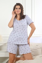 Халат женский из гладкокрашенного трикотажно полотна «кулирка» с набивным рисунком, полуприталенного силуэта, с короткими рукавами покроя «реглан» и горловиной овальной формы, окантованной основным материалом, с центральной бортовой застежкой на тесьму «молния». По срезу горловины выполнены неглубокие складки, нижние резы рукавов обработаны притачными манжетами с кантом контрастного цвета.