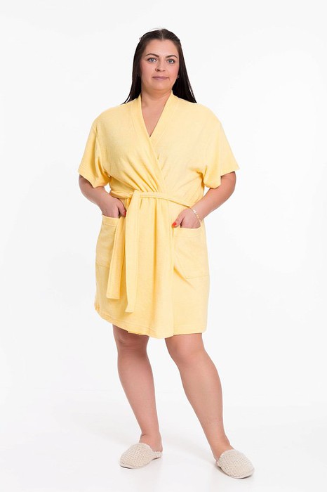 Халат имеет свободный крой с запахом и поясом, что позволяет регулировать посадку. Накладные карманы и короткий рукав делают модель удобной и практичной. Спущенная линия плеча придаёт изделию стильный вид.