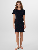 Халат женский из трикотажного полотна «кулирка» с набивным рисунком полуприлегающего силуэта, с горловиной овальной формы, окантованной основным материалом, короткими втачными рукавами с притачными манжетами. В боковых швах, смещенных в сторону полочки, обработаны карманы.