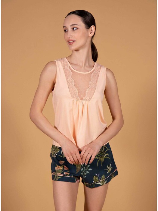 Домашняя пижама от торговой марки Indefini. В комплект входит майка-топ и шорты.