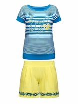 В комплект входит футболка прямого свободного кроя с короткими рукавами, отложным воротником и пуговицами, что придаёт ей элегантный вид.