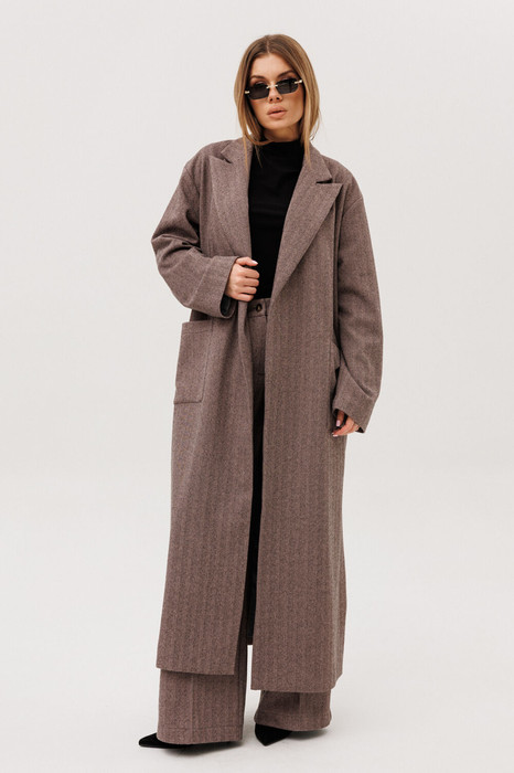 Кардиган женский,выполнен из теплой ткани, свободного силуэта со спущенным плечом,в боковых швах разрезы. Рукав длинный. По переду накладные карманы.Кардиган на подкладке. Пояс из основной ткани в комплекте.