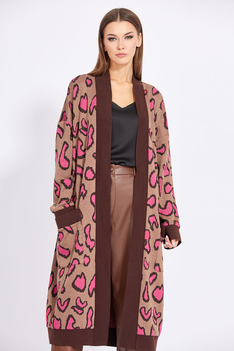 Кардиган выполнен из трикотажного полотна с анималистичным принтом. Кардиган прямого силуэта, длиной ниже линии колена. Спинка цельная. Перед состоит из двух половинок. Спереди накладные карманы. Горловина спинки и борт выполнены из довяза. Плечевой шов спущен. Рукав одношовный. Низ рукава, низ кардигана и верх кармана выполнены из довяза.