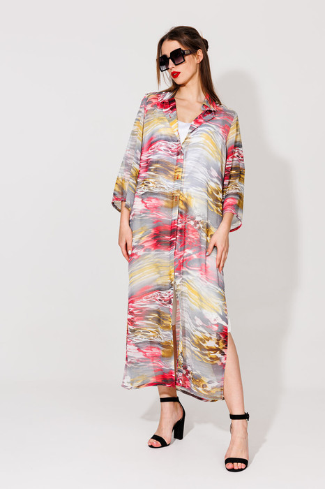 Кардиган прямого кроя  с акцентным принтом. Горловина обработана рубашечным воротником с отрезной стойкой. Модель со слегка приспущенной линией плеча и рукавами длиной 7/8. Застёжка центральная на петли и пуговицы. По низу изделия разрезы.