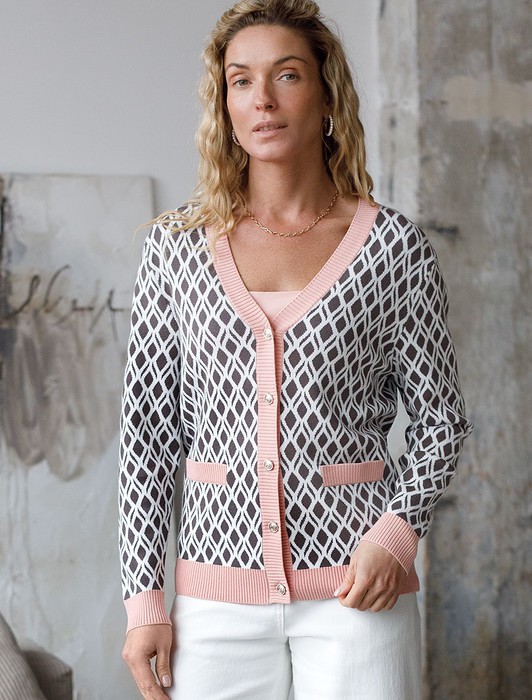 Состав: 83%Вис 17%ПЭКардиган с V-вырезом жаккардовой вязки — универсальная и женственная вещь для весны и лета. Жакет кофейно-белого цвета выполнен из приятной к телу вискозы, отличается в меру свободным кроем, который подчеркивает силуэт. V-вырез подчеркивает зону декольте и визуально вытягивает шею, делая фигуру более изящной. Спущенная линия плеча создает расслабленный силуэт, добавляя комфорта и свободы движений, что отлично подойдет для девушек и женщин плюс сайз размеров. Модель на пуговицах обеспечивает удобство в носке и добавляет классическую нотку образу. Контрастная отделка гармонично сочетается с выразительным геометрическим рисунком, который придает образу индивидуальность и современность. Принт немного напоминает благородный орнамент аргайл, Карманы-обманки украшают, сохраняя лаконичность внешнего вида, Кардиган средней длины оптимален для создания разных комбинаций на каждый день. Такой жакет легко впишется в офисный или повседневный образ благодаря своей универсальности и современному стилю. Вискоза дарит ощущение комфорта даже в теплую погоду, а качественная жаккардовая вязка сохраняет форму после стирки.
