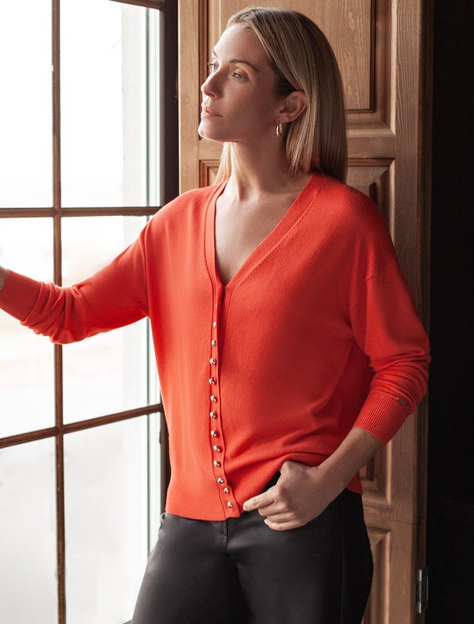 Состав: 80%Вис 20%ПАКардиган тонкой вязки выполнен из нежной пряжи вискозы с нейлоном. Лаконичный силуэт дополнен яркой фишкой изделия - ряд золотистых пуговиц, визуально вытягивающий силуэт. Очень приятное к телу изделие, в котором будет не жарко даже в самые теплые дни. Изделие дополнено логотипом бренда.