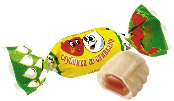 Карамель «Клубника со сливками» – ароматное удовольствие, знакомое с детства многим сладкоежкам. Перламутровая сливочная карамель с яркой ягодной начинкой с насыщенным вкусом и ароматом спелой клубники. Классическое сочетание ягодного и сахарно-сливочного вкусов, нежное, хрустяще-тающее удовольствие к чаю и кофе.