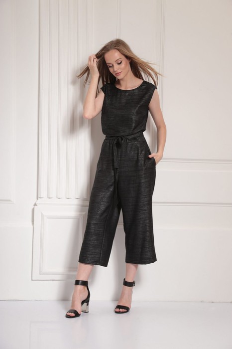 Трендовая вещь этого сезона - комбенизон - кюлоты. Ткань под лен с легким напылением блеска. По спинке V-образный вырез и удобная молния. В боковых швах каманы. Изделие без подкладки.