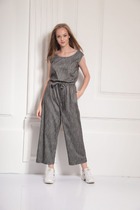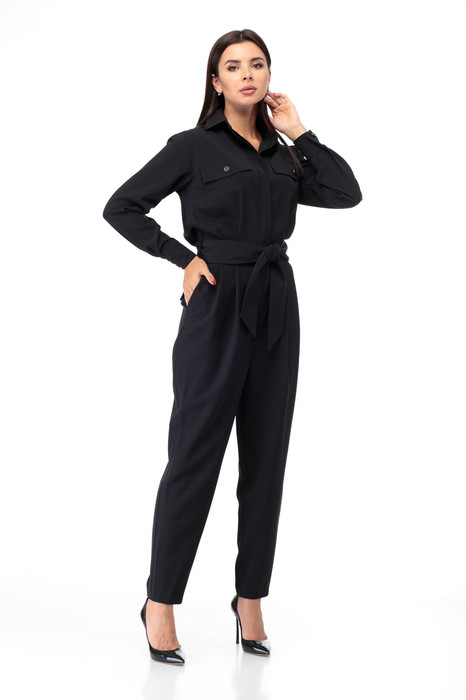 Комбинезон полуприлегающего силуэта, на передних частях обработаны нагрудные вытачки и клапаны, потайная застежка планка на петли и пуговицы, спинка с кокеткой, по центру складка на свободу движения.