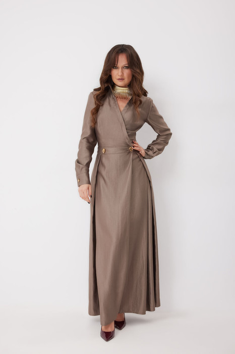 Комбинезон женский, отрезной по линии талии. Верхняя часть с рельефами по переду и вытачками по спинке. Воротник стояче-отложной. Застёжка на запах, на петли, пуговицы и потайную магнитную кнопку. Рукав втачной длинный, заканчивается манжетой с застежкой на петли-пуговицы. Нижняя часть комбинезона со складками и имитацией запаха. В боковых швах карманы. По спинке резинка на уровне талии.