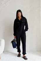 Комбинезон с отрезной планкой по переду, центральной застежкой на петли и пуговицы. По верхней части переда накладные карманы с клапанами. Комбинезон с втачным поясом, пояс присборен на резинку. На передних половинках нижней части комбинезона выполнены накладные карманы с клапанами. Рукав втачной, длинный, с отрезной манжетой.