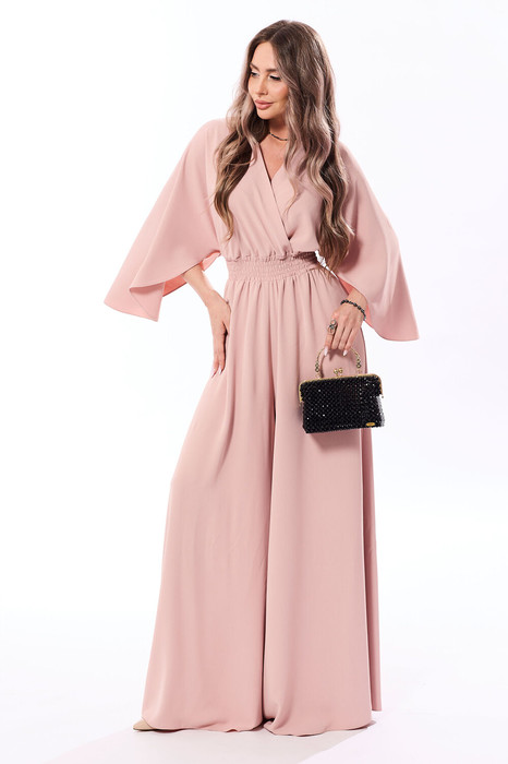 Комбинезон с застежкой на навесную петлю и пуговицу по горловине спинки, с цельнокроенным рукавом- крылышко. Лиф переда с V-образным вырезом горловины, полочки расположены на запах. Лиф спинки со средним швом. Комбинезон с втачным поясом. Пояс присборен эластичной нитью- венгеркой.