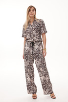 Комбинезон женский  из штапеля, свободного силуэта, со спущенной линией плеча, с втачным поясом на уровне линии талии, в который вставлена эластичная тесьма.  Лиф детали переда комбинезона со средним швом, на уровне талии обработаны 2 складки. Нижние части с рельефными швами, которые заканчиваются разрезами, в боковых швах обработаны наклонные карманы. Лиф детали спинки комбинезона с запахом, вверху которого обработан разрез с застежкой на 1 навесную петлю и пуговицу, по середине застежка на 1 потайную кнопку. На нижней части по шву притачивания пояса обработаны по одной вытачке на каждой половинке. Рукава втачные двухшовные, короткие, с разрезами. Вырез горловины комбинезона «V-образной» формы, обработан обтачкой.