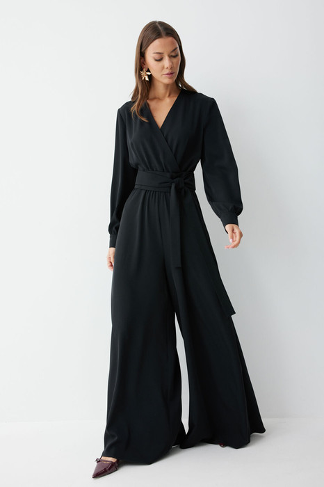 Комбинезон полуприлегающего силуэта с расширенными книзу брюками из струящейся ткани. Комбинезон отрезной по линии талии на резинке, верхняя часть комбинезона на запах. Рукав втачной, длинный, по низу манжета с застежкой на петлю  и пуговицу. На спинке в среднем шве  застежка на потайную молнию. В боковых швах карманы. В комплект входит пояс. Обращаем ваше внимание, что фурнитура может отличаться от фото.