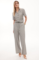 Комбинезон полуприлегающего силуэта, выполнен из хлопковой ткани «шитье». Застежка с притачными планками на кнопки. Линия талии отрезная, на передних частях брюк складки, в боковых швах карманы. Спинка с отрезной кокеткой и складкой. Воротник стойка. Рукав втачной. В комплекте съемный ремень. Перед на подкладке. В брюках хлопковая подкладка в виде шорт.